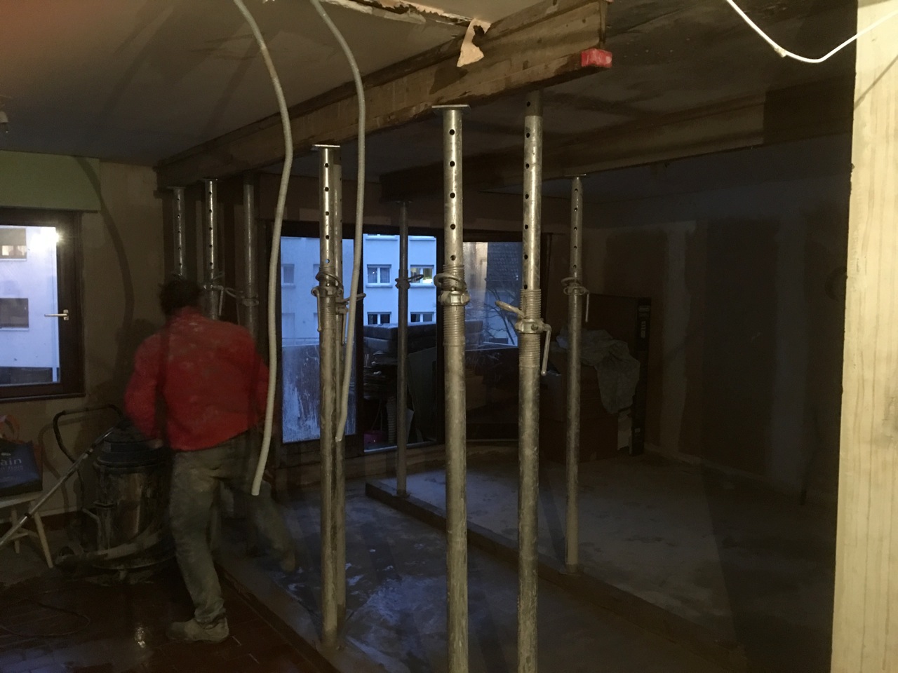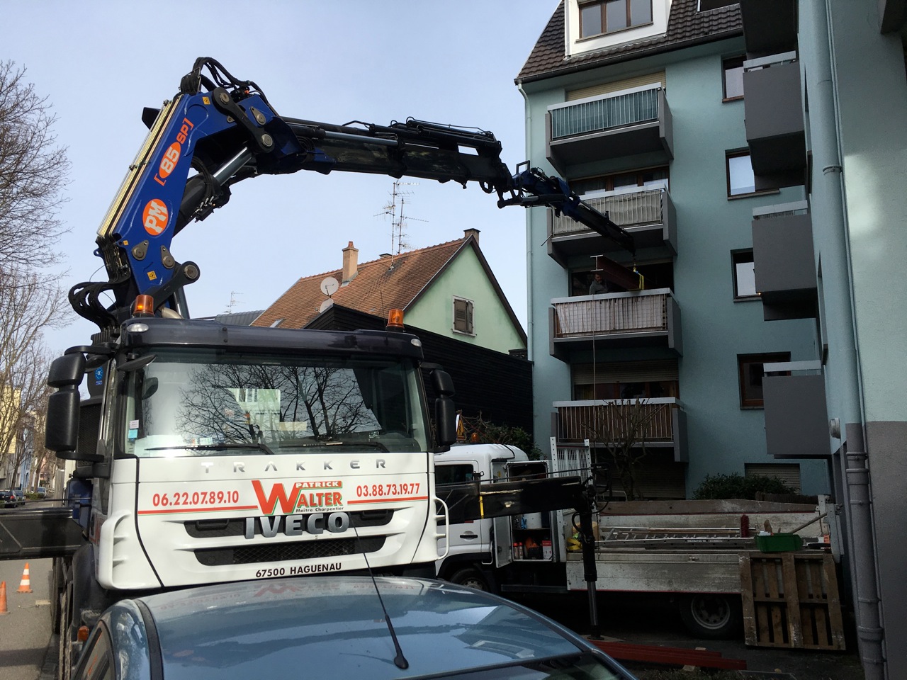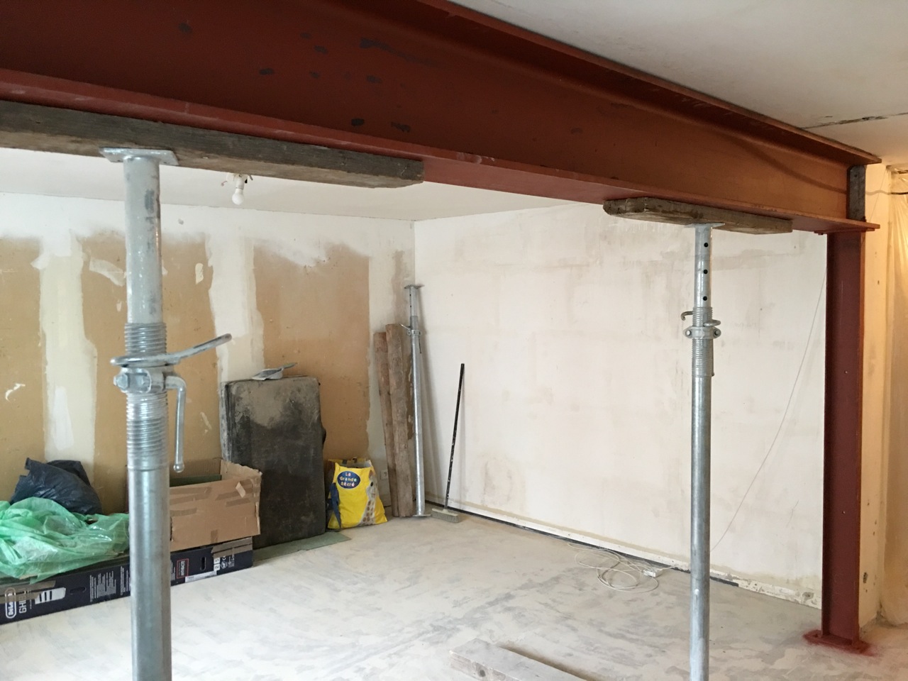 Mise en place d'une poutre métallique de type HEB d'un poids 950 kg soutenue par deux poteaux.